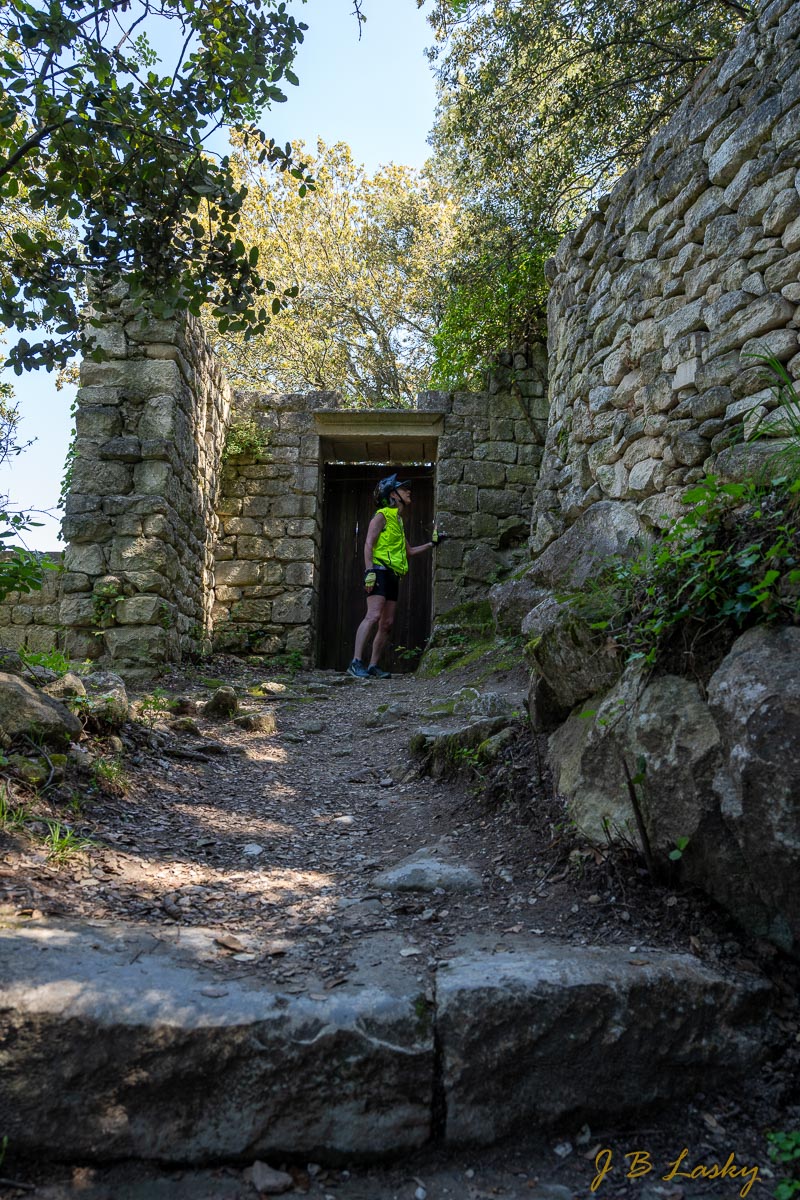 Mary examining ruins in Oppede le Vieux, Provence